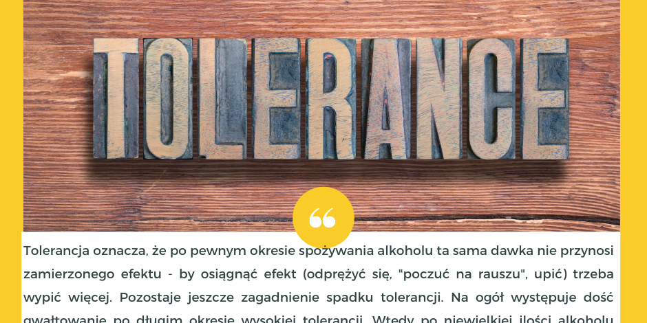 ➡️Pojęcie „tolerancja” oznacza, że po pewnym czasie spożywania alkoholu ta sama ilość nie przynosi zamierzonego/oczekiwanego efektu – aby go osiągnąć (mieć fazę, poczuć humor, upić się)- trzeba wypić po prostu więcej. Tolerancja objawia się tym, że osoby regularnie i dużo pijące nie wykazują objawów bycia pod wpływem alkoholu. W przypadku osób pijących okazjonalnie pojawić się mogą już poważne zaburzenia. Zatem tolerancja umożliwia spożywanie większych ilości alkoholu, gdyż osoba pijąca nie doświadcza znacznych skutków swojego picia. W przypadku osób pijących regularnie i systematycznie idzie zauważyć wzrost tolerancji. Nie ma znaczenia czy ktoś ma „mocną” czy „słabą” głowę, regularne picie powoduje wzrastanie tolerancji na działanie alkoholu. Pod wpływem powtarzającej się obecności w organizmie alkoholu, następuje adaptacja układu nerwowego by umożliwiać funkcjonowanie pod wpływem substancji. Jest to jedna z właściwości mózgu odpowiedzialna za powstawanie uzależnienia. Tolerancja alkoholu jest stałą tendencją. Istnieje oczywiście szansa, że osoba pijąca wypije mniej niż zwykle, a będzie odczuwać mocniejsze działanie alkoholu.